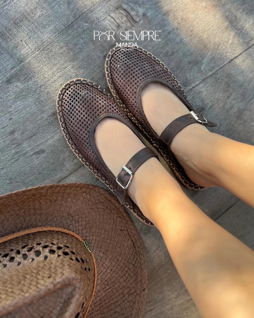 Alpargata tipo zueco WARA chocolate en cuero con delicado efecto calado en su capellada, que le aporta un toque rústico y elegante. Cuenta con pulsera de ajuste para mayor sujeción y una base artesanal de EVA, super liviana, pensada para acompañarte todo el día con comodidad. Ideal para quienes buscan estilo y confort en cada paso.
