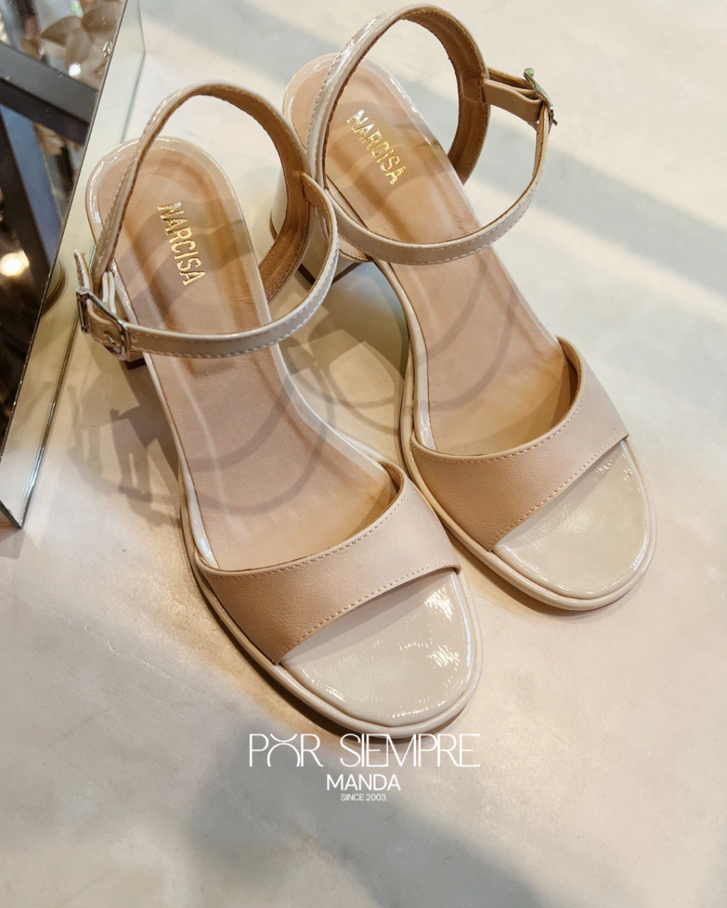 Sandalia de fiesta clasica en color negro, capellada de cuero graneado corte pañielo que estiliza el pie, y taco de 7cm y plataforma de 1cm totalmente forrado antimanchas y facil de limpiar el cuero bajo brillo.