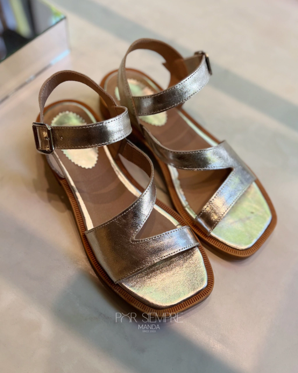 Sandalia de cuero artesanal color platino, con tira cruzada en su capellada, pulsera clasica y pequeño elastico en su lateral para mayo comodidad y adaptabilidad. Es un verdadero comodín! y LO COMODAS QUE SON ni hablar. Base antideslizante con taco de 2cm.