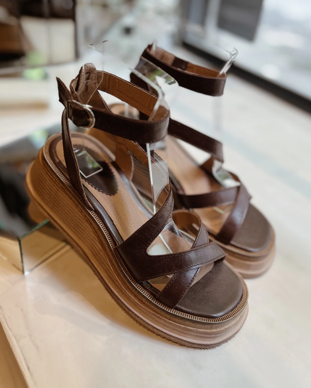 Sandalia de cuero color chocolate, de tiras cruzadas que estilizan la pierna, pulsera clásica.